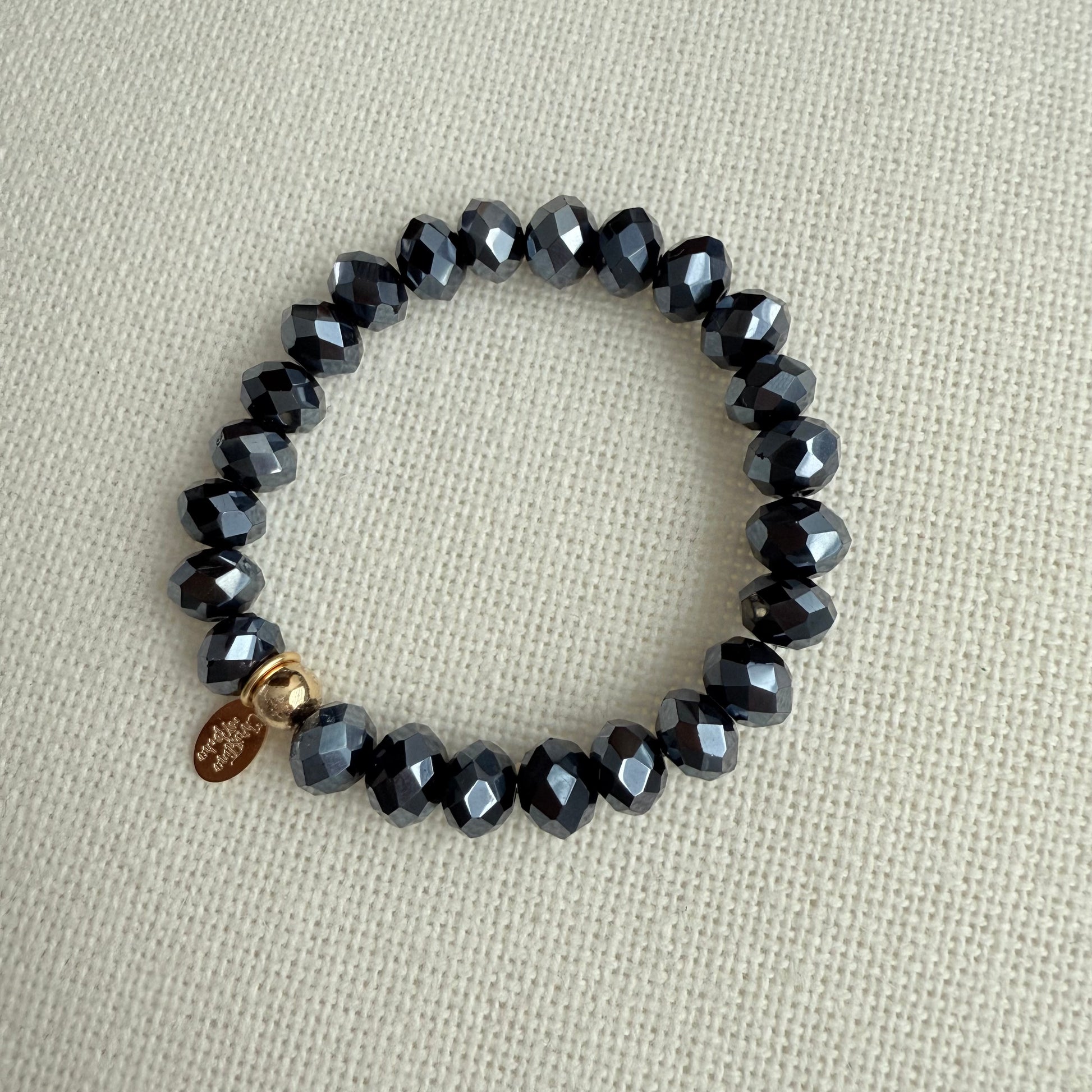 Handmade with 10mm dark grey Murano glass beads, this finely crafted bracelet adds a subtle, sophisticated touch to any outfit.