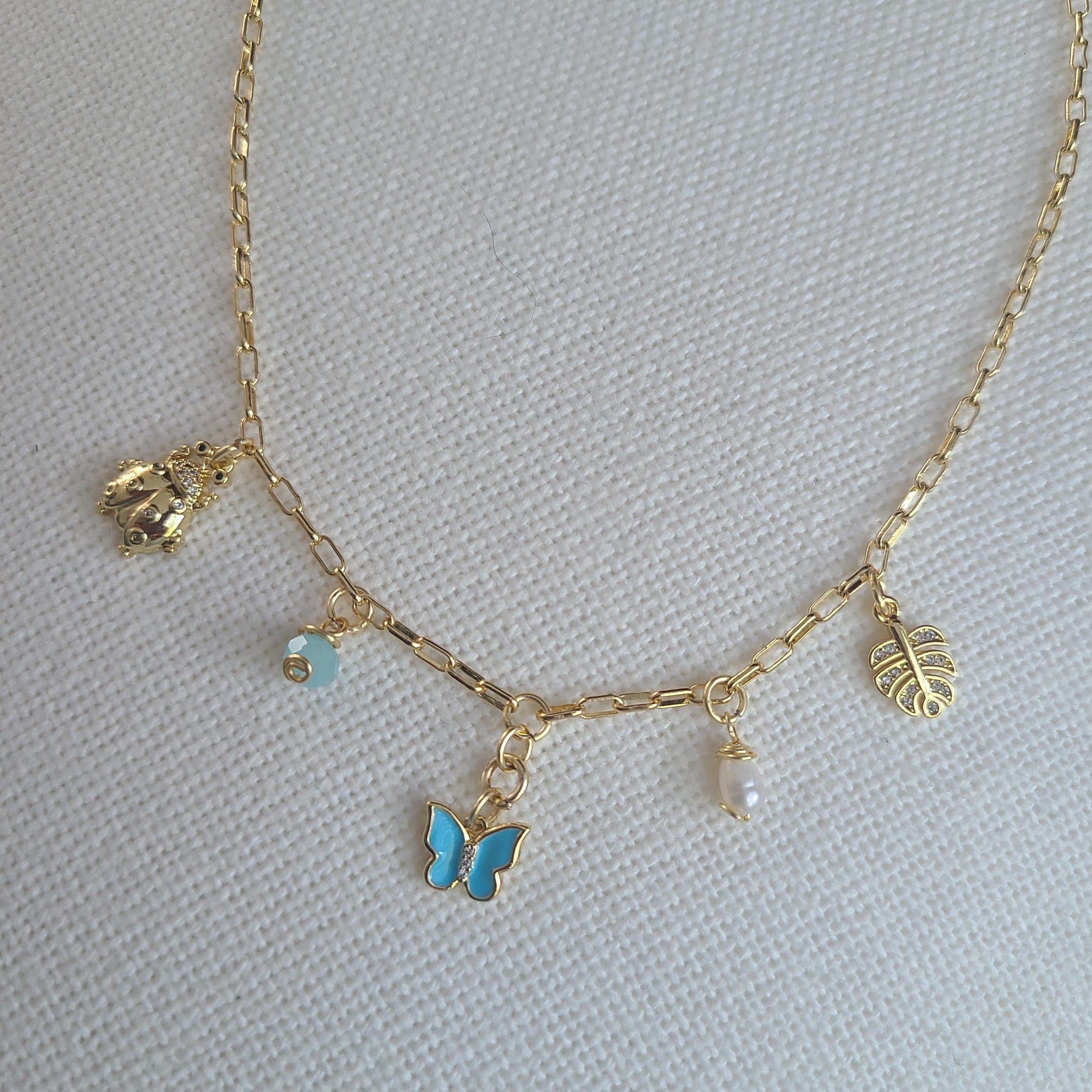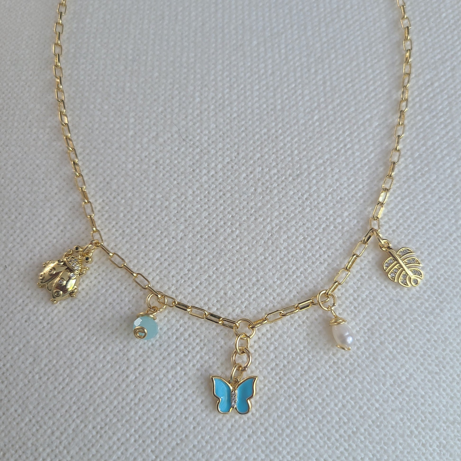 This delicate 14k gold-filled necklace is adorned with a charming selection of pendants: a soft blue butterfly, a graceful leaf, a sweet little ladybug, a freshwater pearl, and a sparkling blue crystal. Each element evokes the beauty of nature and adds a whimsical, elegant touch to this unique piece.