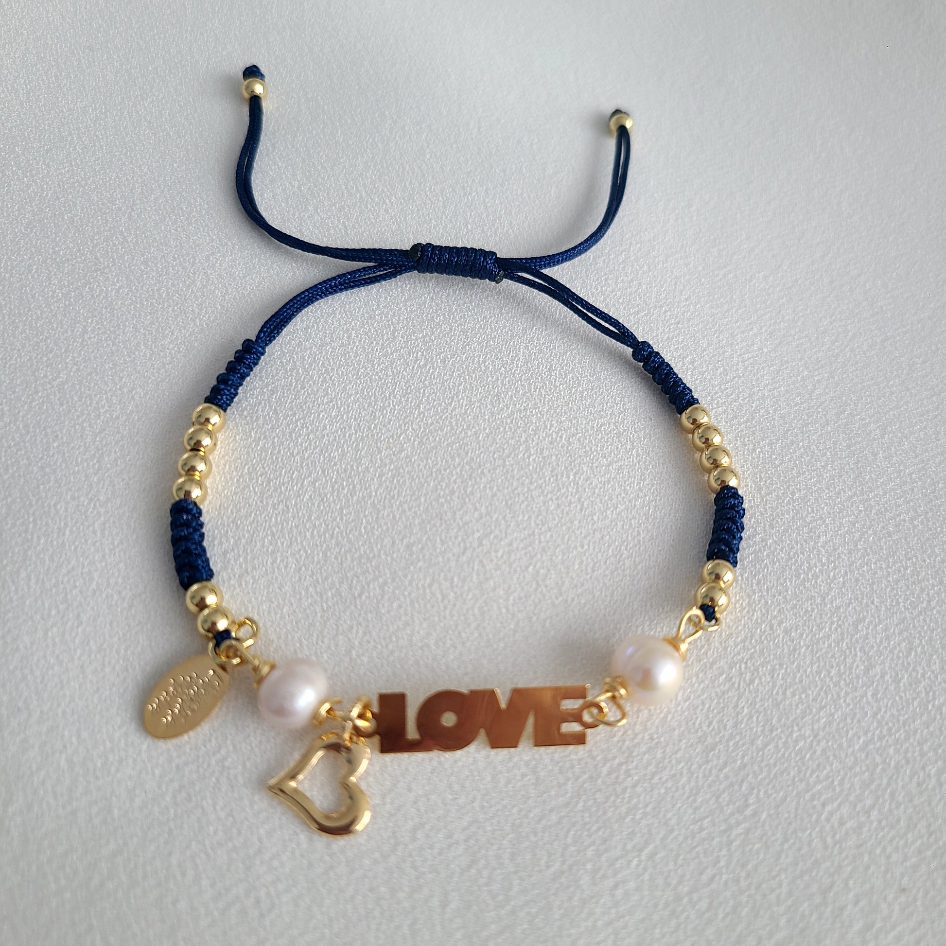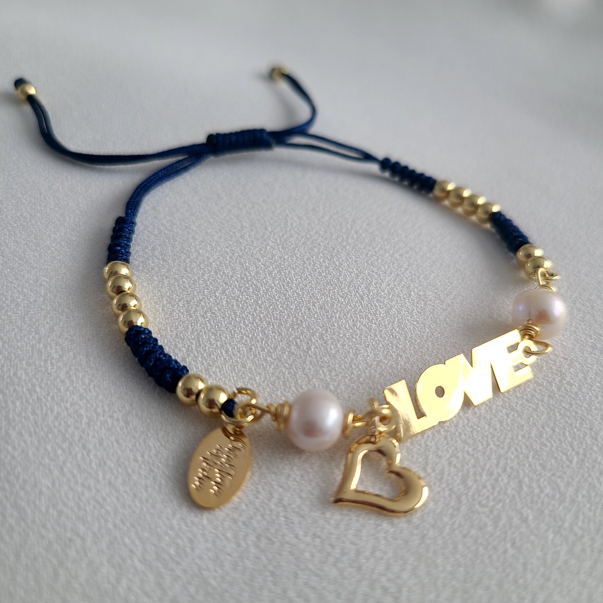 An adjustable, one-of-a-kind bracelet handcrafted with freshwater pearls, a delicate "Love" charm, a tiny star, and 14K gold-filled beads. A sweet and meaningful piece that adds softness, sparkle, and intention to any look.