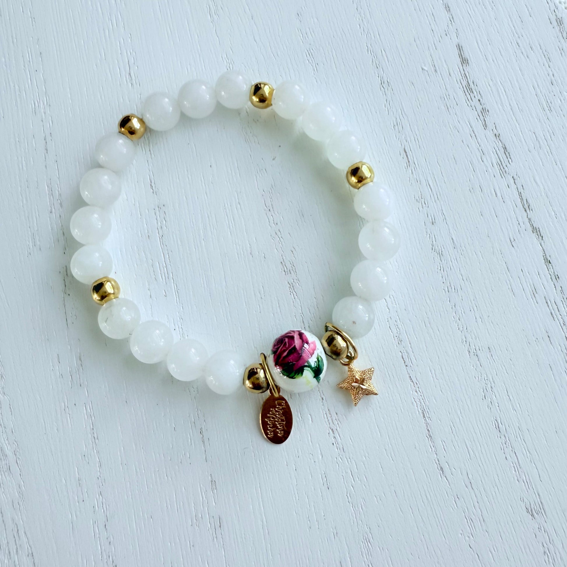 A refined bracelet crafted with luminous white Jade gemstones and 14K gold-filled accents. At its center shines a decorative floral stone, symbolizing grace and renewal, while a delicate star charm adds a personal and poetic touch. A timeless piece designed to radiate elegance and meaning.