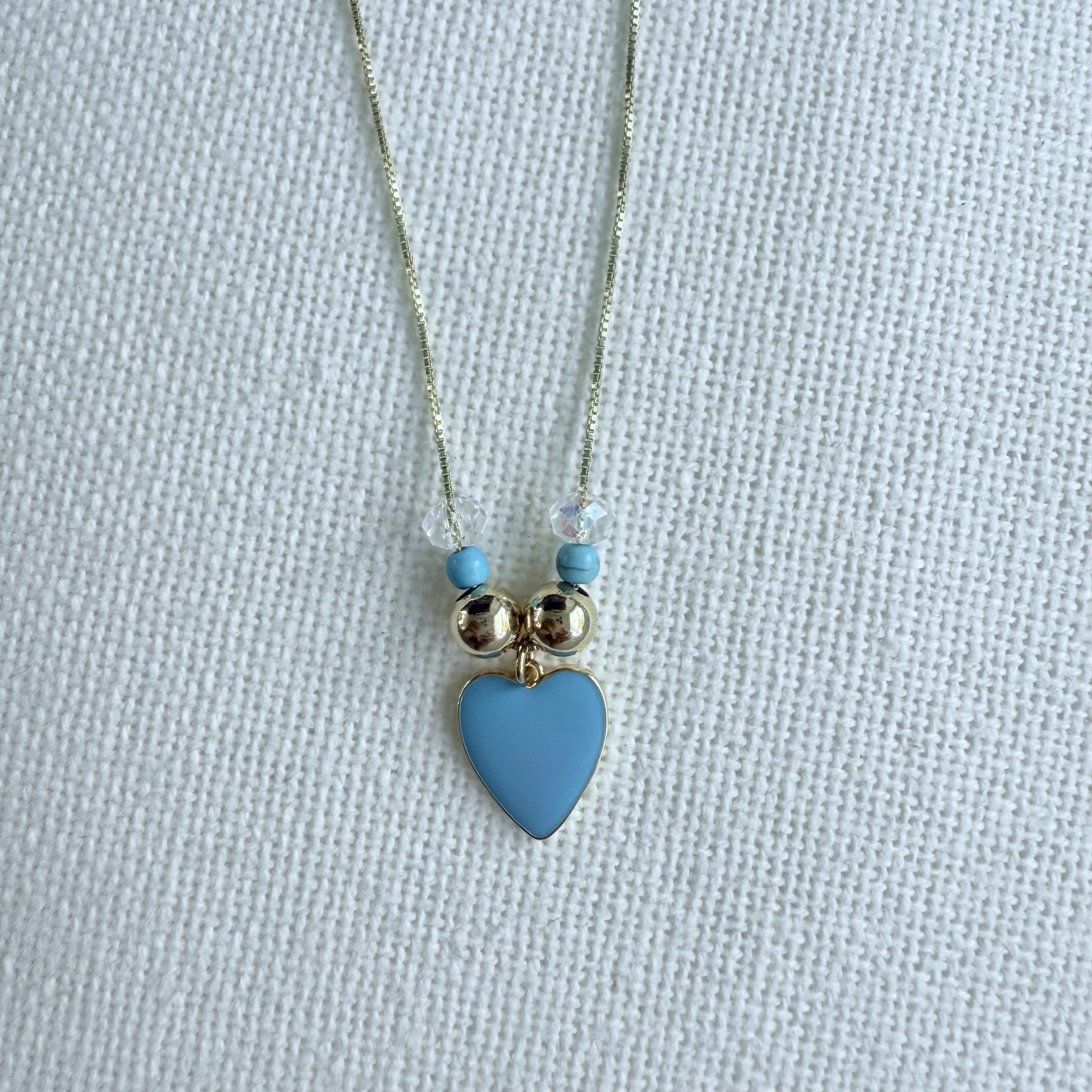 This delicate 14K gold filled necklace features a light blue heart pendant, surrounded by golden beads, two Murano crystals, and soft turquoise stones that add a fresh and luminous touch. Its refined design and harmonious blend of colors make it the perfect accessory to bring elegance, serenity, and timeless charm to any look.