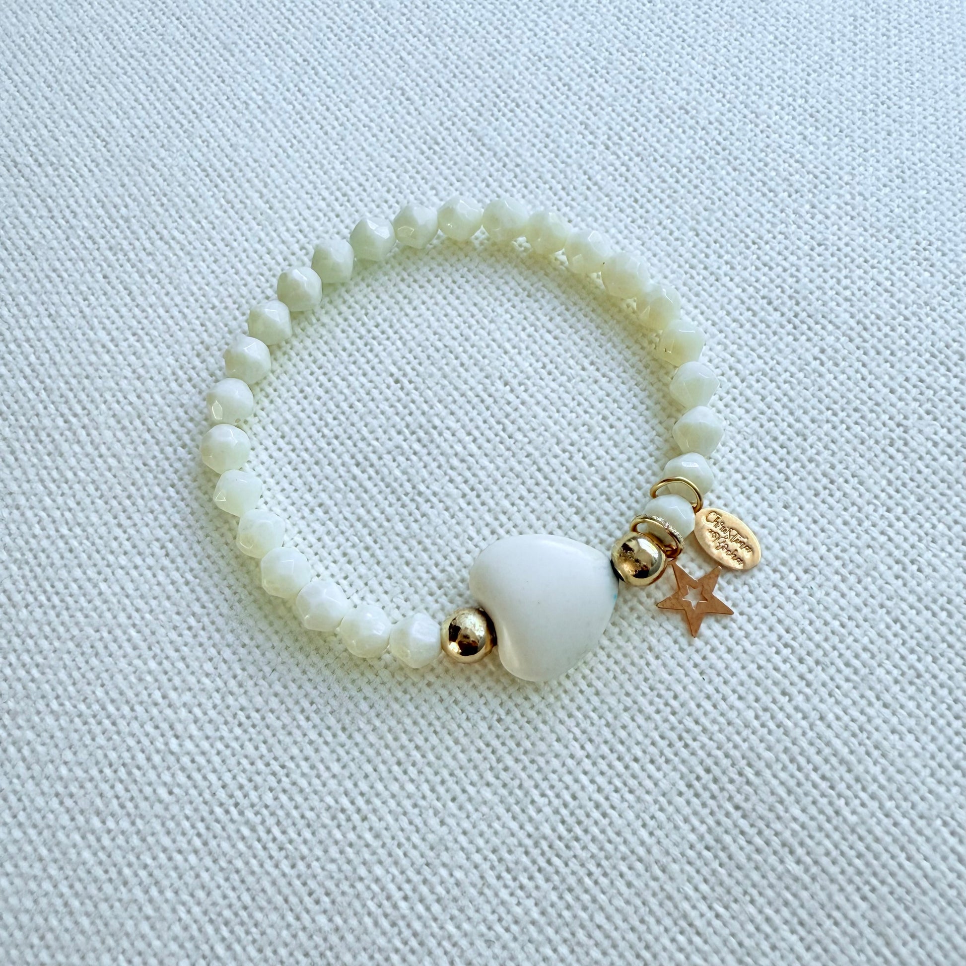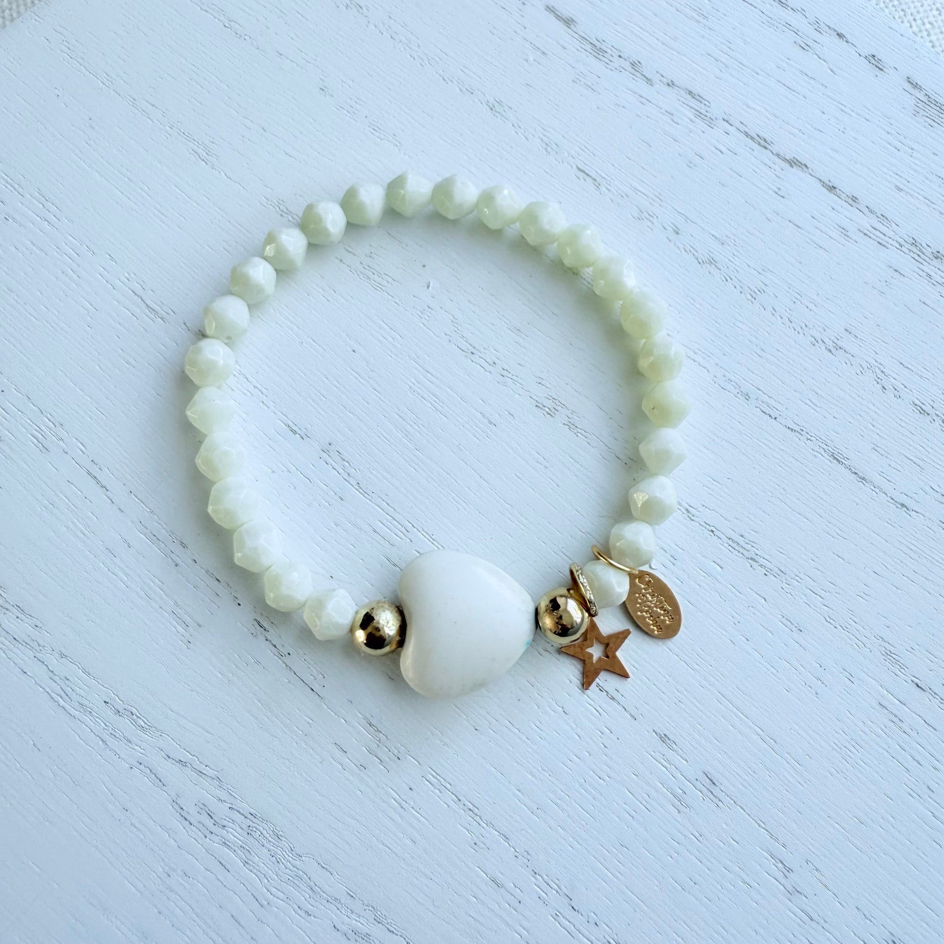 Handmade with natural white stones and a central white turquoise heart, this bracelet features delicate 14K gold-filled accents. Minimalist, elegant, and perfect for everyday wear or layering.
