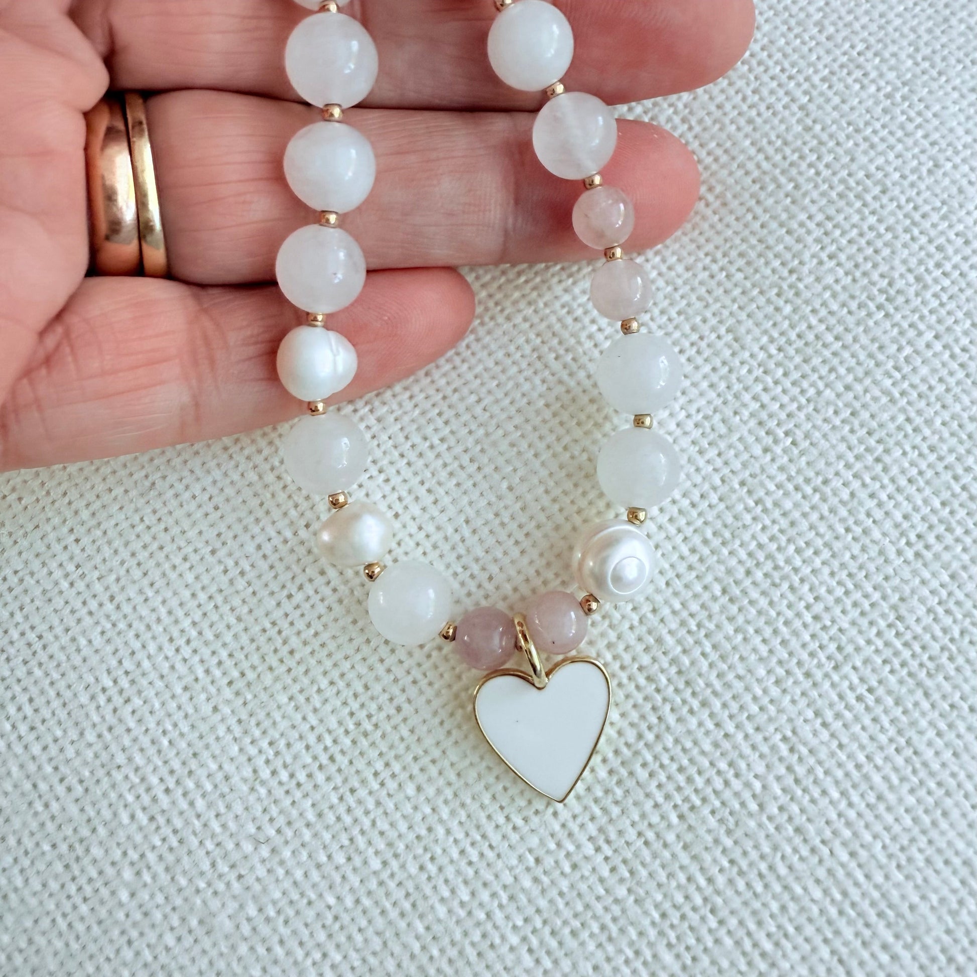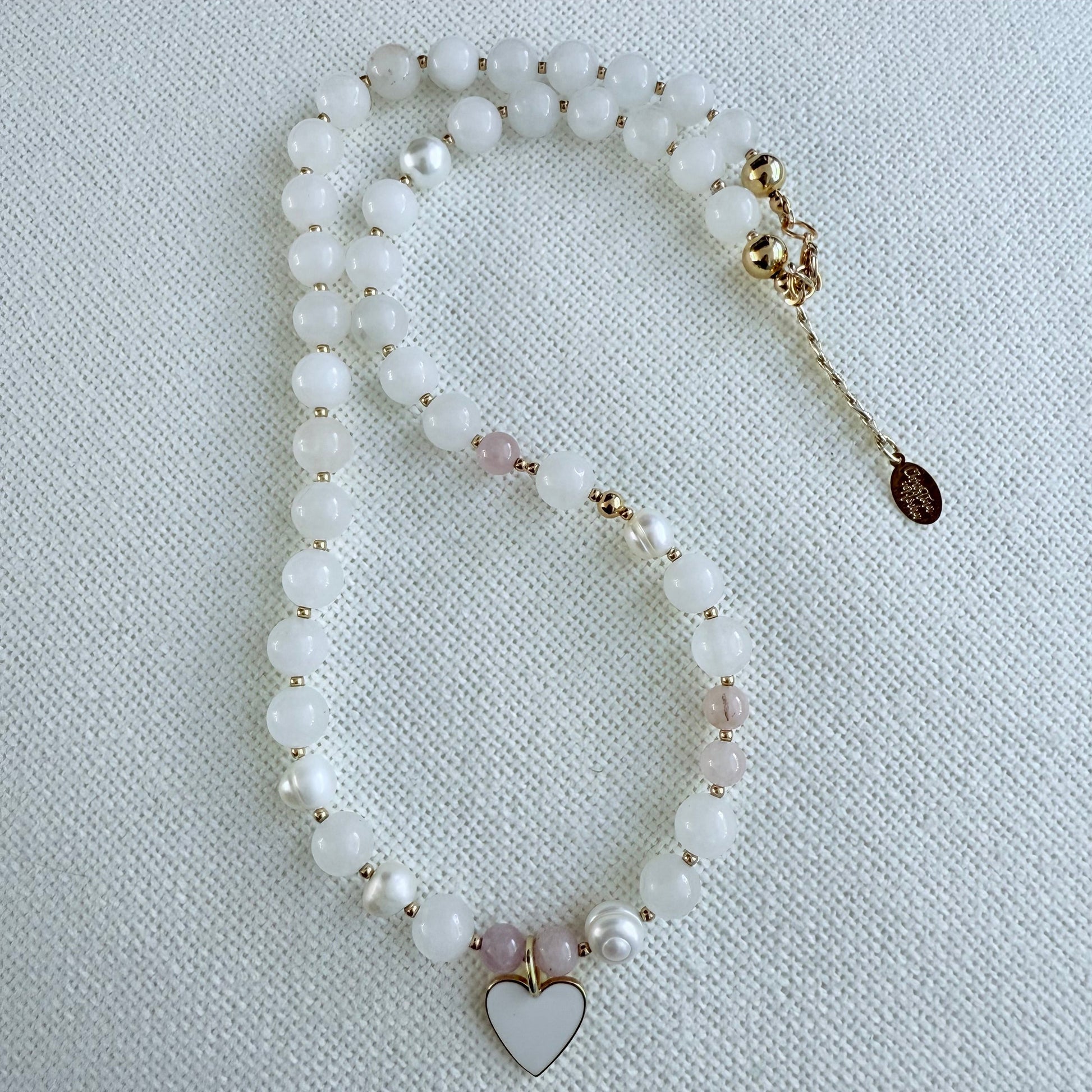 This handcrafted necklace is a one-of-a-kind piece, blending the softness of white quartz with the delicate blush jade and the elegance of pearls. At the center, a beautiful white heart adds a romantic and sophisticated touch, while 14K gold filled details provide a subtle and lasting shine.