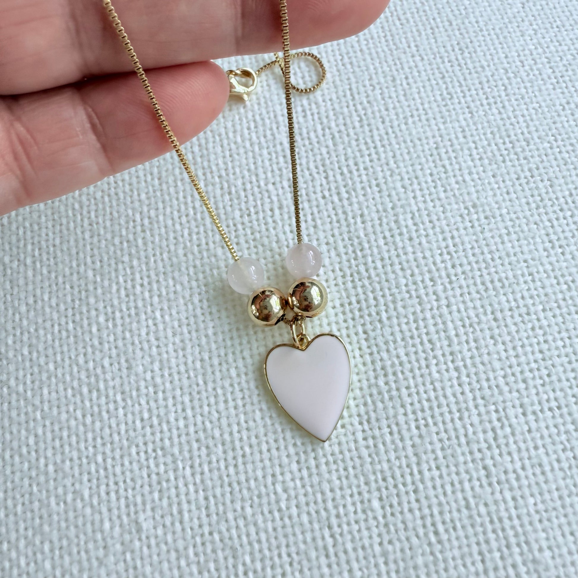 This delicate 14K gold filled necklace features a soft pink heart pendant, accented with golden beads and Murano crystals in matching pink tones. Feminine and refined, it radiates a gentle sparkle that adds warmth and romance to any look — a timeless piece that captures the essence of subtle elegance.