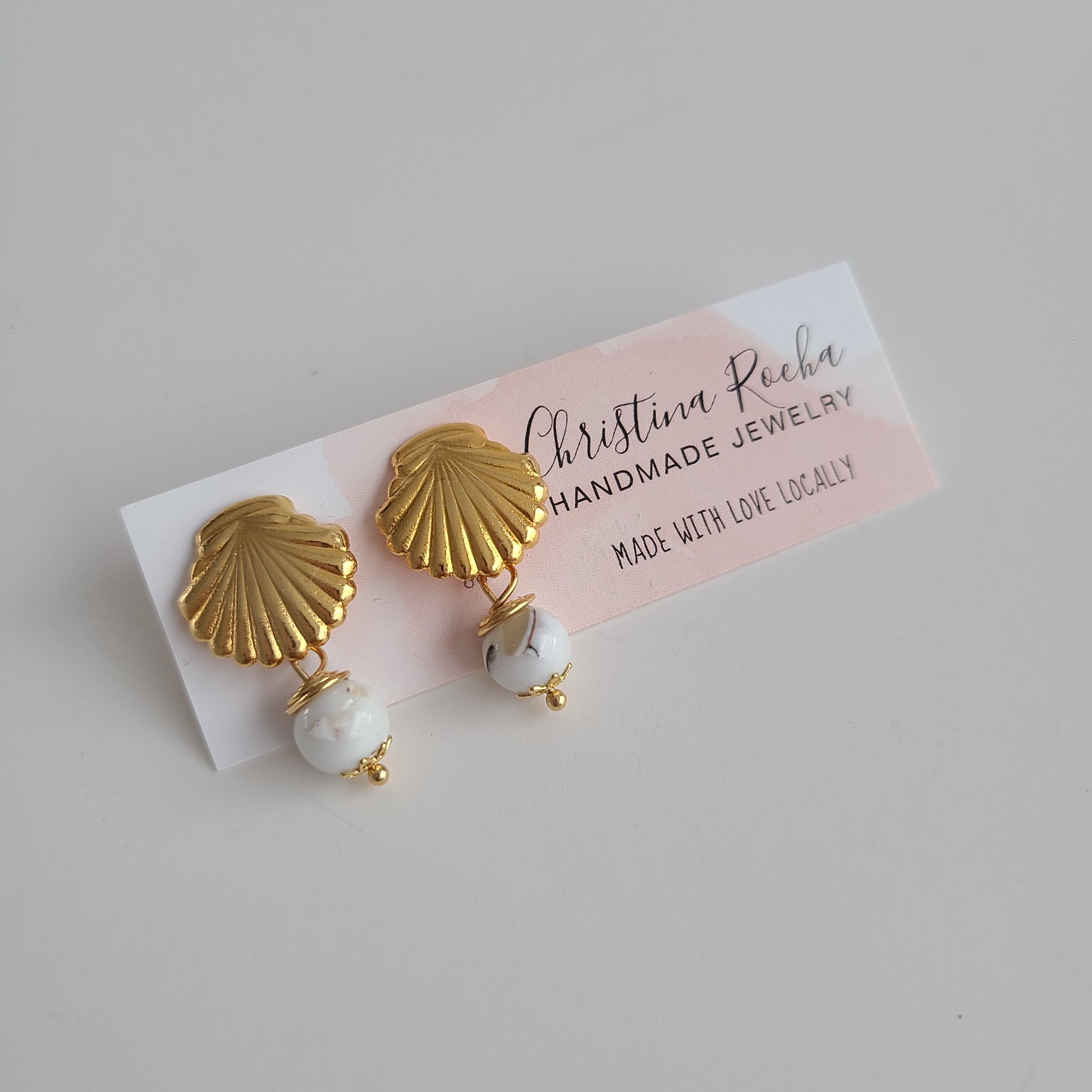 These beautiful earrings are handmade and feature 14K gold filled sea shell and white hematite gemstones.