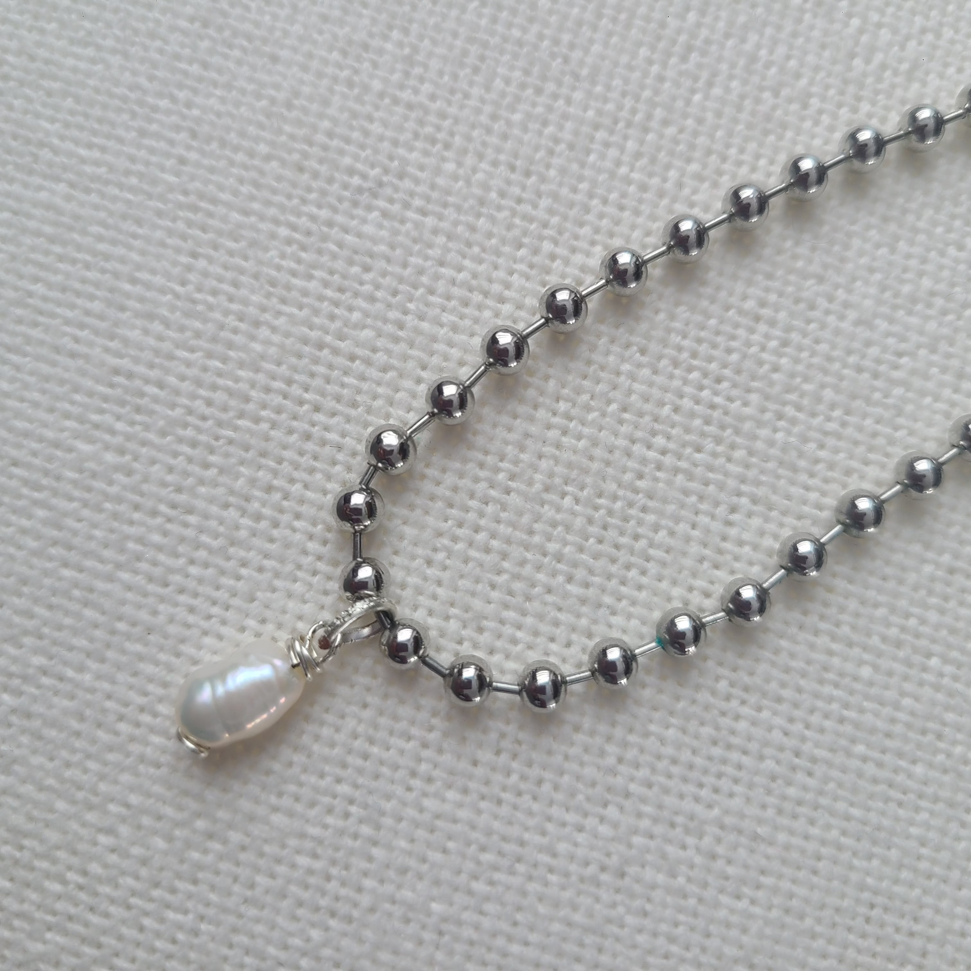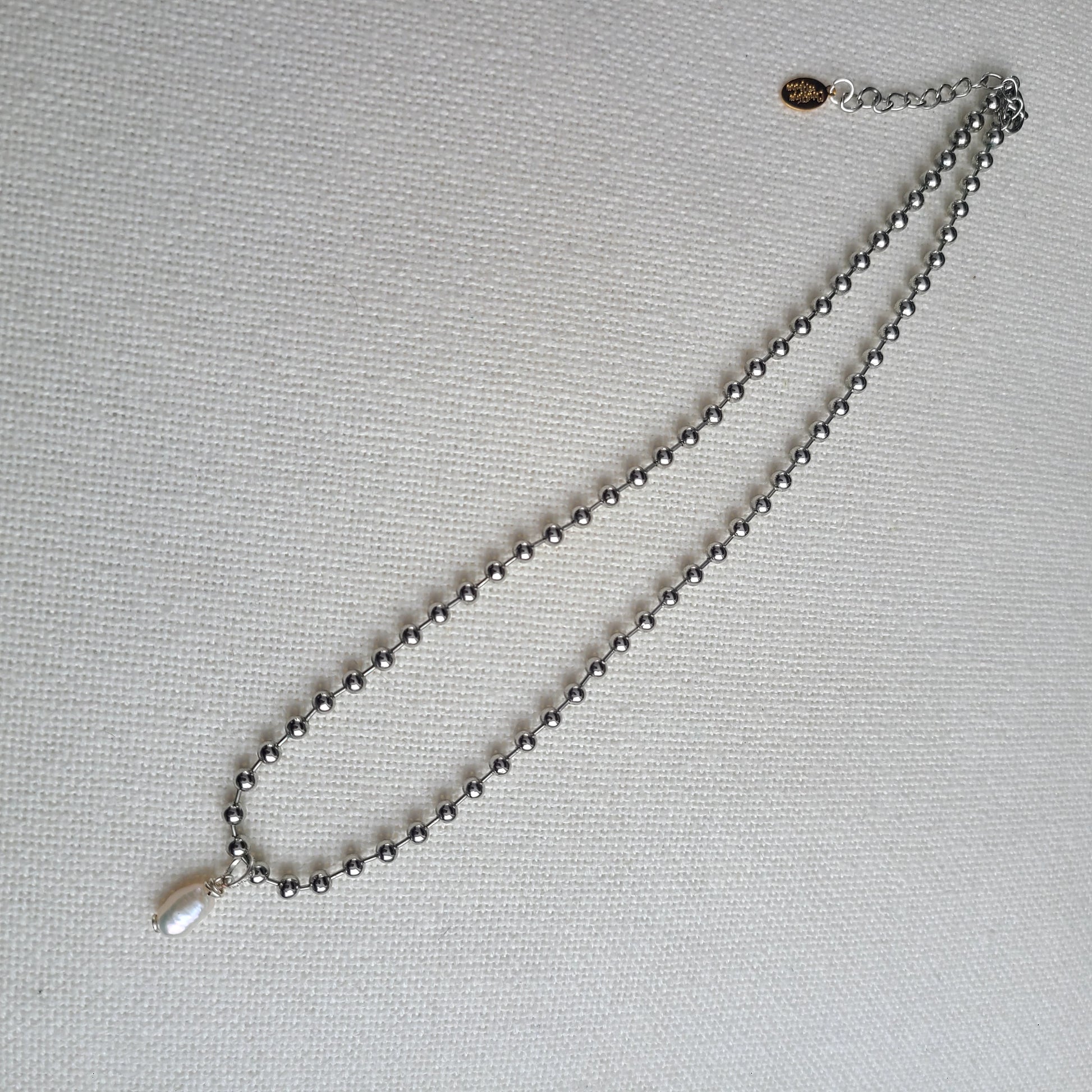 Beautiful necklace made with silver rhodium ball chain with freshwater pearl charm.