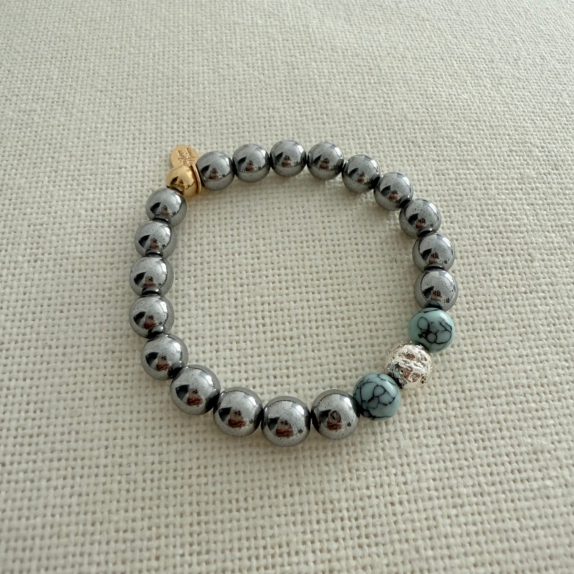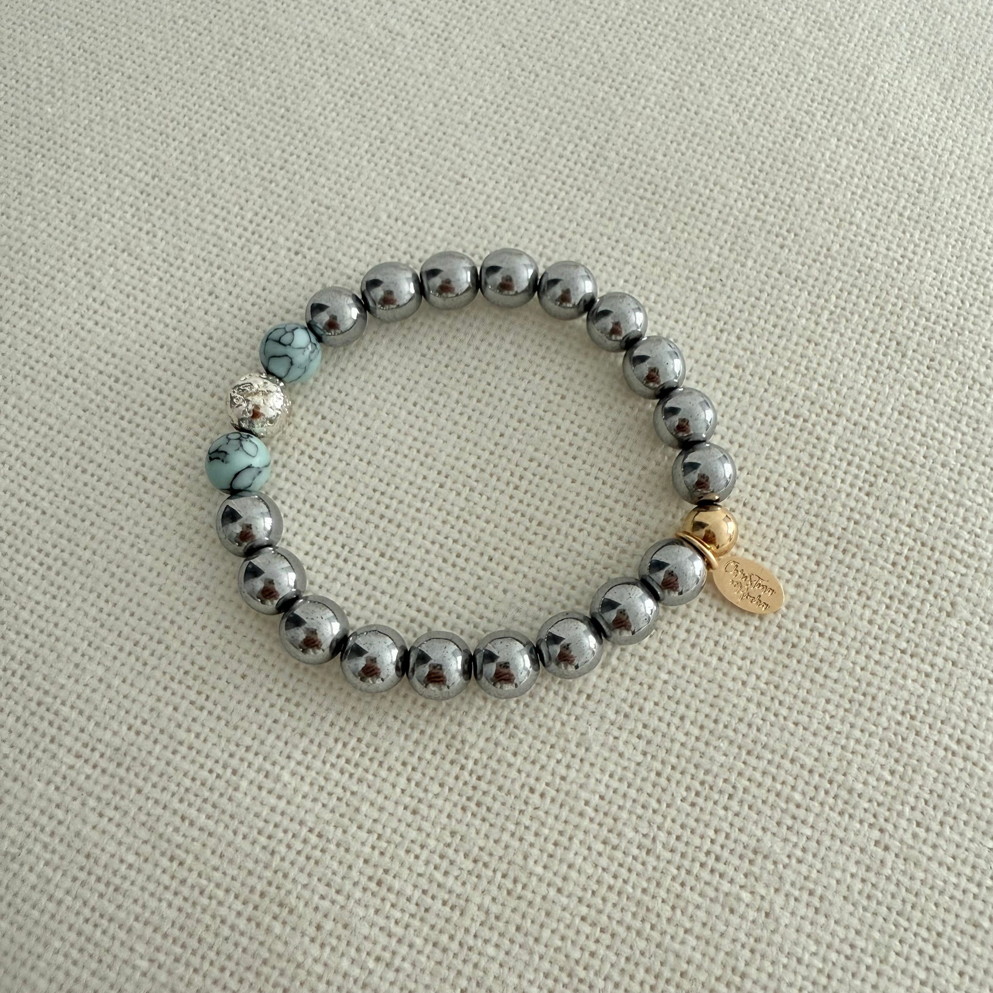 Handcrafted with 10 mm gray-silver hematite stones, this bracelet exudes understated elegance. At its center, two delicate light blue turquoise stones create a soft, serene contrast, adding a subtle touch of color and refinement.