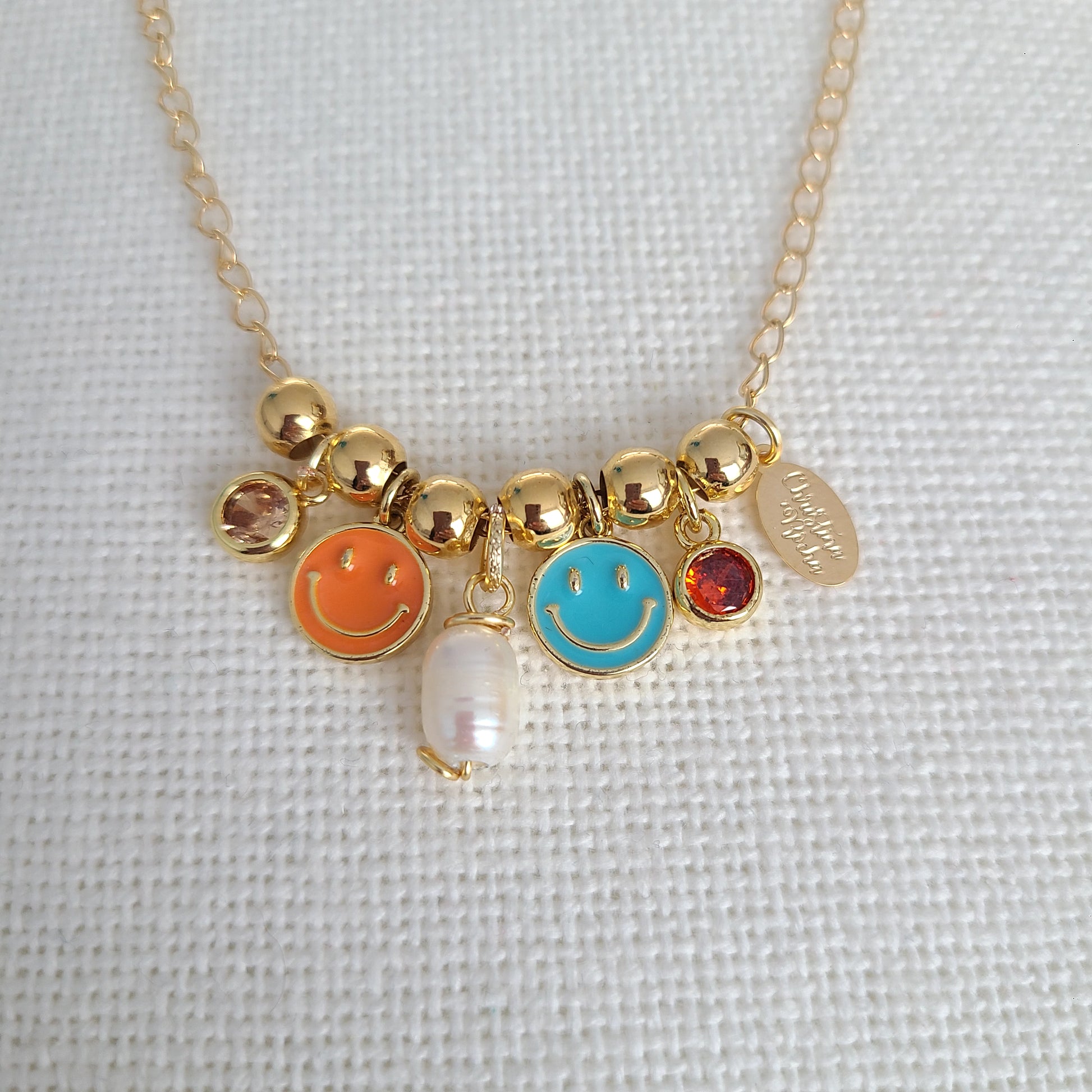 This delicate, one-of-a-kind necklace is a celebration of joy, color, and feminine elegance. Crafted in 14K gold-filled material, it features a charming combination of playful smiley face charms, vibrant colored crystals, and a luminous freshwater pearl.