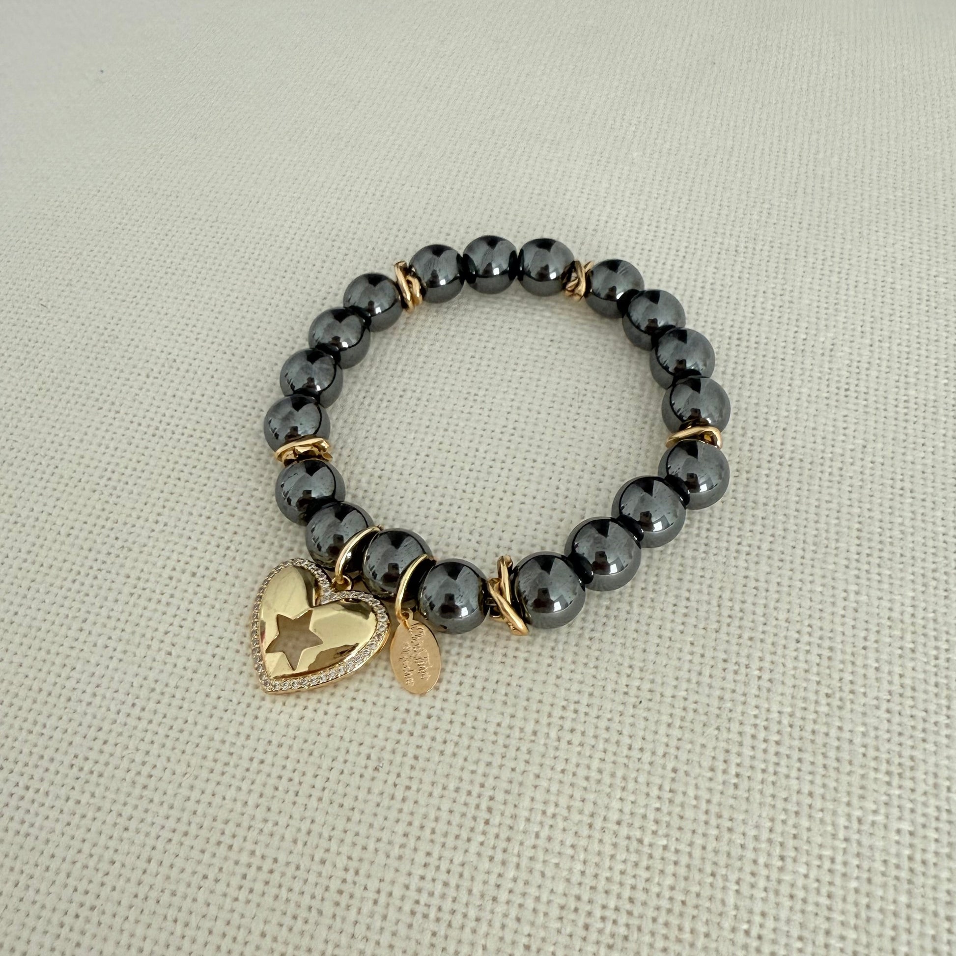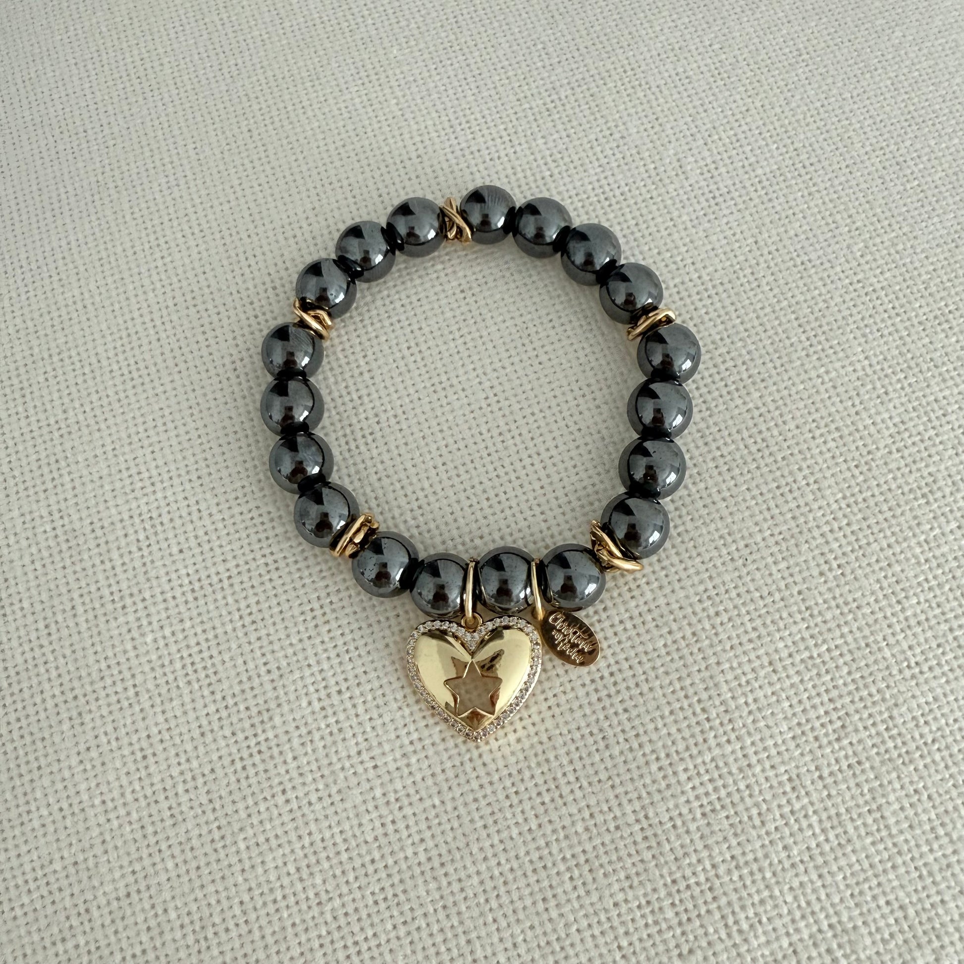 Handcrafted with dark silver hematite stones and delicate 14K gold-filled accents, this bracelet exudes elegance and warmth. At its center, a beautiful and delicate heart charm shines, creating a subtle yet striking contrast.