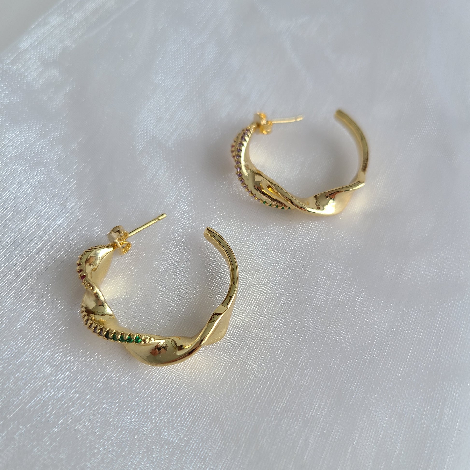 These beautiful 24K gold plated hoop earrings, feature a multicolored dainty crystals. They are super light, modern and hypoallergenic.