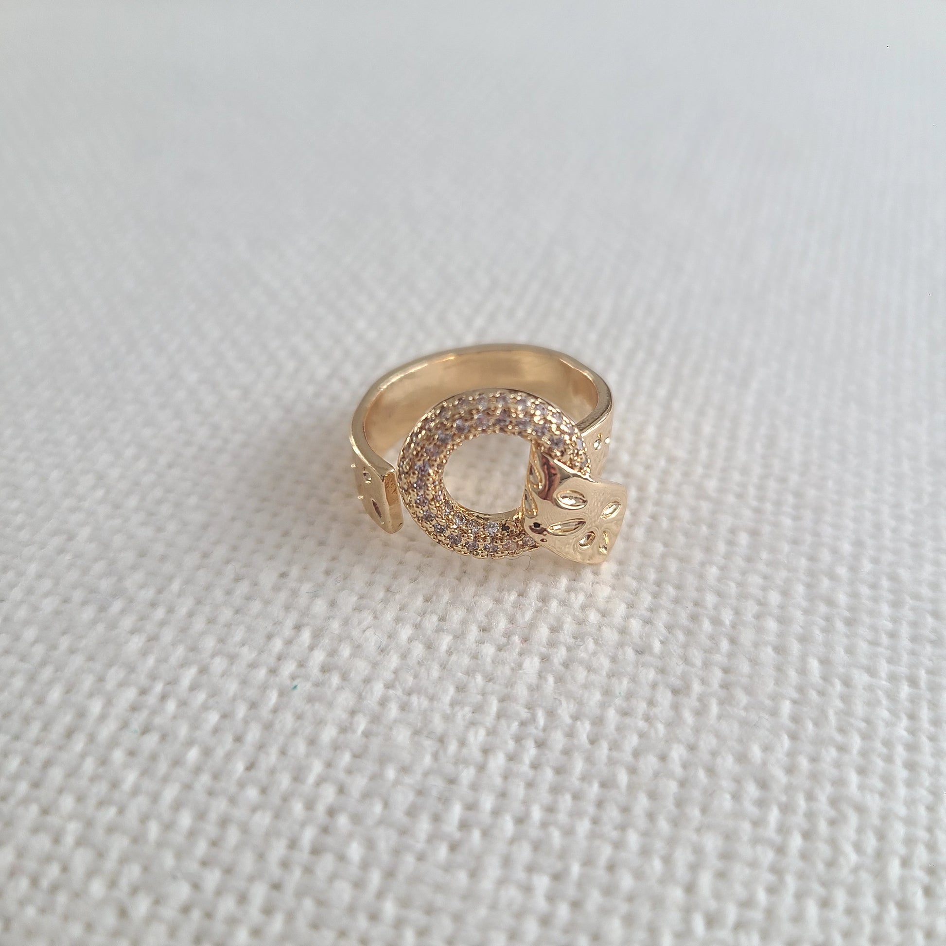A bold yet elegant piece, this unique gold rhodium ring features a belt-inspired design that wraps stylishly around your finger. Adjustable, hypoallergenic, and full of character, the perfect statement for everyday chic.