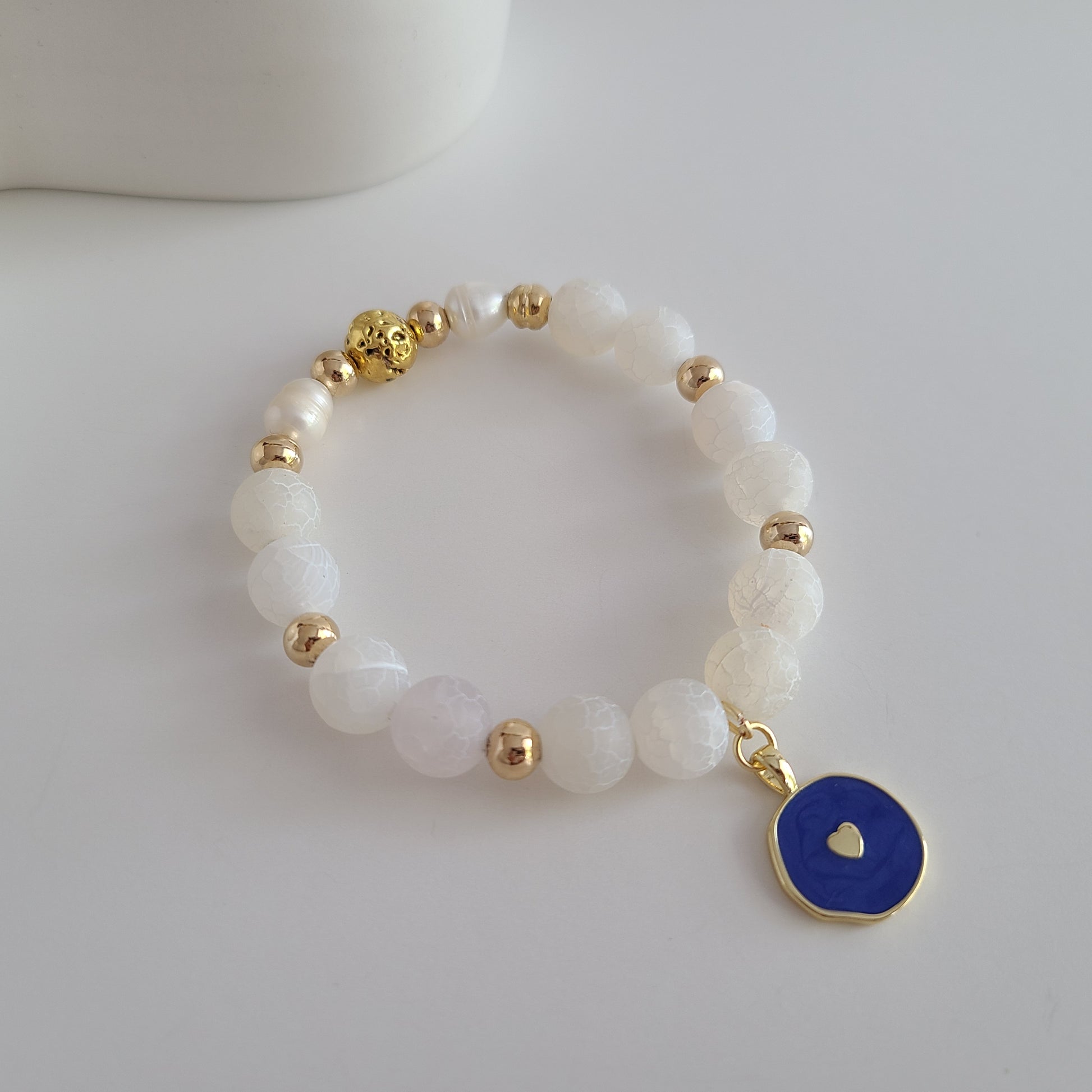This beautiful and delicate bracelet is handcrafted with 8mm white Jade gemstones and 14k gold filled beads. The bracelet features a beautiful blue heart charm.