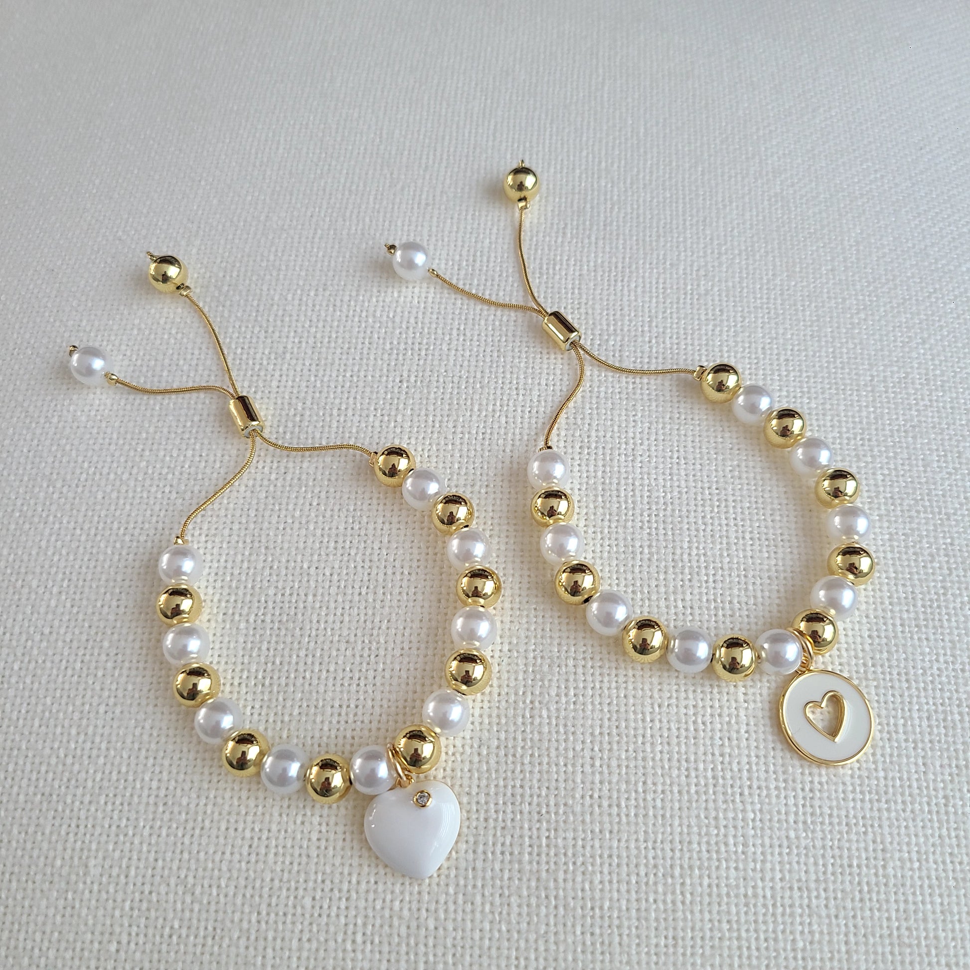 This adjustable bracelet features shimmering 14k gold-filled beads paired with sparkling crystal pearls for a delicate, refined look. It is adorned with charming white heart charms—available in two distinct designs, adding a touch of elegance and femininity to the piece.